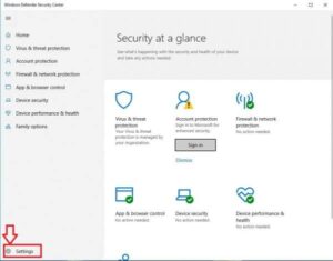 Bước 1: Truy cập vào ô tìm kiếm và gõ Windows Defender Security Center, sau đó chọn mục tương ứng hiện ra. Tại giao diện chính, nhấp vào biểu tượng Cài đặt (hình bánh răng ở góc trái dưới cùng).