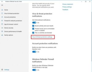Bước 2: Nhấn vào Virus & threat protection settings (Cài đặt bảo vệ chống virus và mối đe dọa).