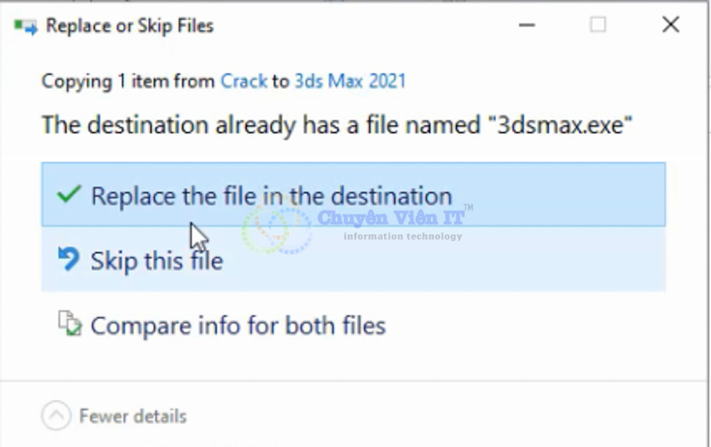 Hệ thống hỏi có muốn ghi đè file cũ không – chọn Replace the file in the destination.