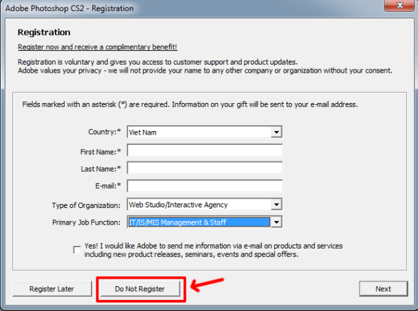 Bước 8: Mở phần mềm Photoshop CS2. Ở lần khởi chạy đầu tiên, nếu xuất hiện yêu cầu đăng ký, chọn Do Not Register để bỏ qua.