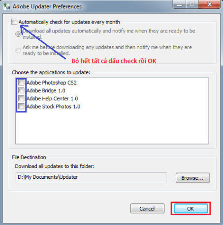 Bước 10: Khi hiện bảng thông báo tiếp theo, bỏ chọn tất cả các ô và nhấn OK để hoàn tất.