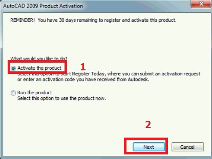 Bước 1: Mở phần mềm AutoCAD 2009 → chọn Activate the Product → nhấn Next.