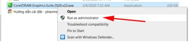 Bước 1: Vào thư mục đã giải nén, tìm file CorelDrawGraphicsSuite2020.exe. Nhấp chuột phải chọn “Run as administrator”.