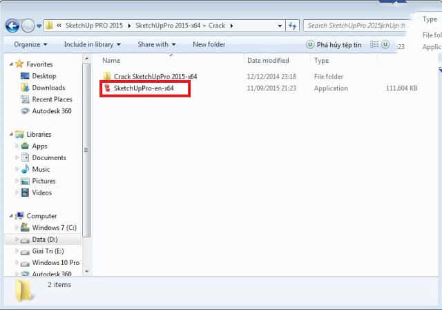 Bước 2: Mở thư mục cài đặt và chạy file SketchUpPro-en-x64.exe để bắt đầu quá trình cài đặt.