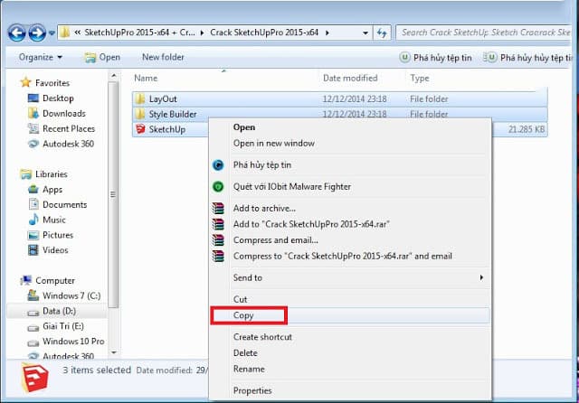 Bước 8: Sau khi cài đặt xong SketchUp 2015, bạn mở lại thư mục SketchUpPro 2015-x64 + Crack đã giải nén trước đó. Tiếp theo, truy cập vào thư mục Crack SketchUpPro 2015-x64 và sao chép toàn bộ các file có trong thư mục này.