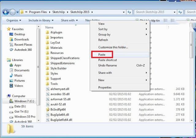 Bước 9: Bạn dán các file vừa sao chép vào thư mục cài đặt mặc định của SketchUp 2015 theo đường dẫn: